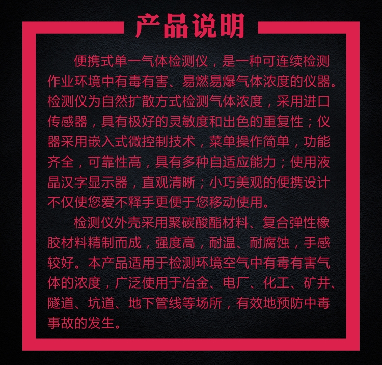 品牌:若素 [查询该品牌全部商品] 单位:台 重量:135 克 检测仪为自然扩散方式检测气体浓度,采用进口传感器,具有极好的灵敏度和出色的重复性;仪器采用嵌入式微控制技术,菜单操作简单,功能齐全,可靠性高。